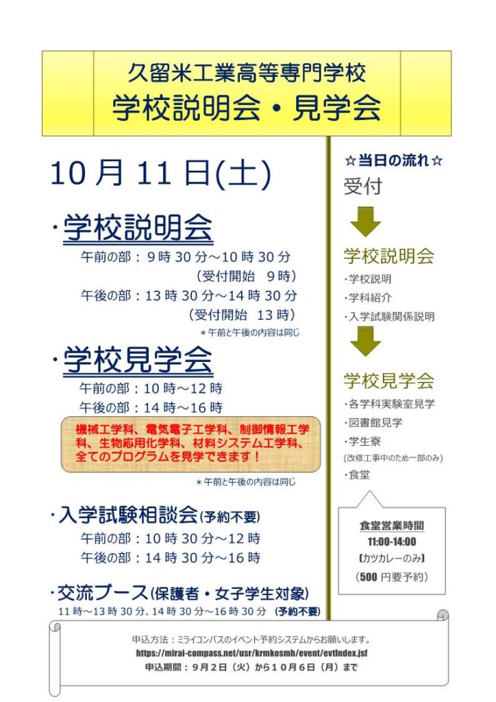 主に中学生並びに保護者の皆様に久留米高専という学校を知ってもらうための催しです。