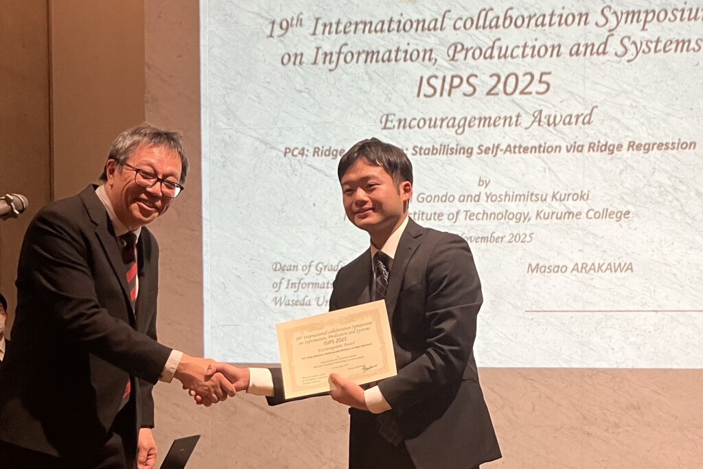 11月28日(金)に早稲田大学大学院情報生産システム研究科で行われた第19回ISIPS(International collaboration Symposium on Information, Production and Systems)にて、機械・電気システム工学専攻2年の権藤優空さんがタイトル「Ridge Attention: Stabilising Self-Attention via Ridge Regression」にてEncouragement Award(奨励賞)を受賞しました。