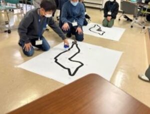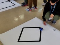 教室では、まず、本校ロボコン部によるデモンストレーションが行われました。その後、プログラミング体験が行われました。プログラミング体験では、まずノートパソコン、micro:bit、Smart Cutebot(自動走行させることができるロボット)を繋ぎ合わせプログラミングの環境を構築し、プログラミングの概要を説明しました。そのあと、プログラムの基本構造である、逐次実行(順次)、反復(繰り返し)、条件分岐(選択)などについて説明しノートパソコンでプログラムを組んで、関連の例題を用いて理解を深めました。最後に、「Smart Cutebot」が、ライントレース経路の黒い線の上を自動で走行するプログラムを組んで実装させる実習を行いました。受講生は好きな経路を選び、ラインの上を周回できるまで、試行錯誤を繰り返しながらプログラムのデバッグ作業に夢中になっていました。講座終了後は次回micro:bitを使用する受講生のために、作成したプログラムをリセットし、後片付け、アンケート回答を行いました。