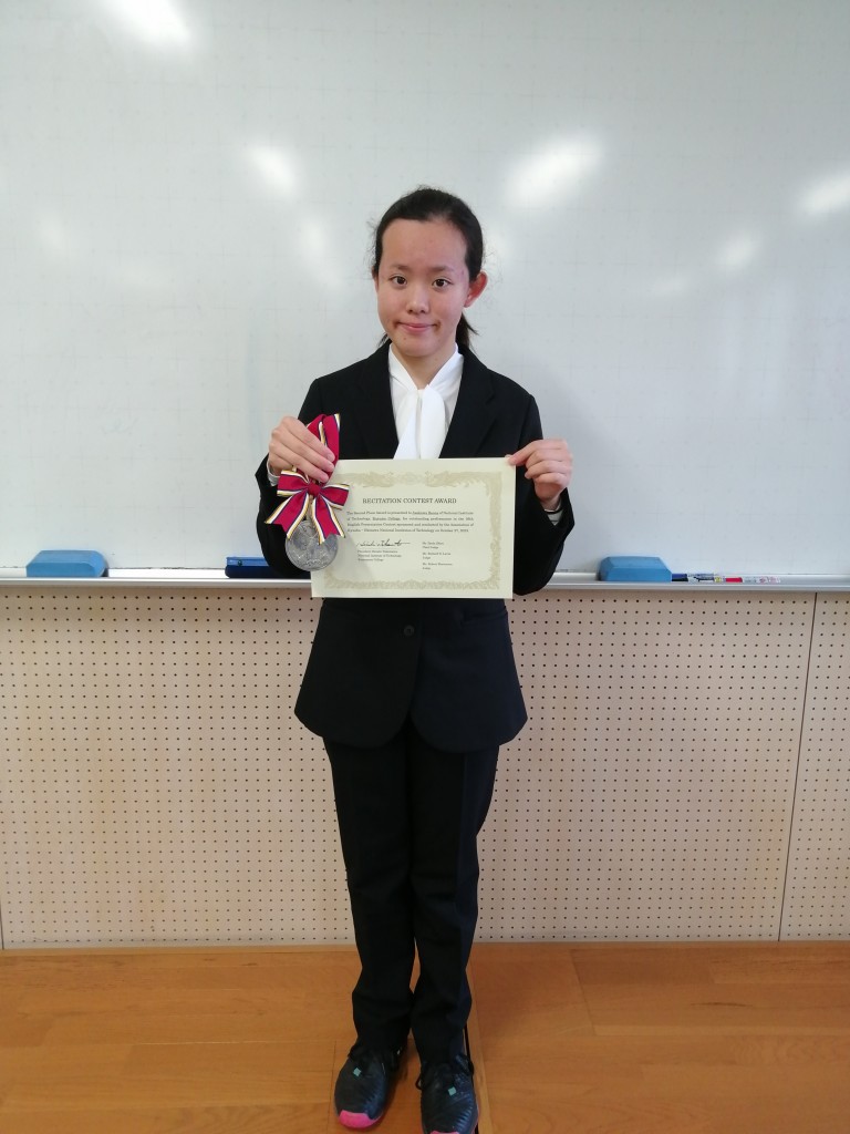 今年度の暗唱部門は,“Heirs to a Lunch”というタイトルの307語の課題文を暗唱して発表するものでした。校内の選考会を経て,夏休み前から丁寧に課題の英文を覚え,先生のアドバイスを受けながら発音の練習をしたり,一つ一つの言葉に合うジェスチャーを考えて練習したりしました。通学途中や勉強の合間,またお風呂の時間等も利用して練習したそうです。